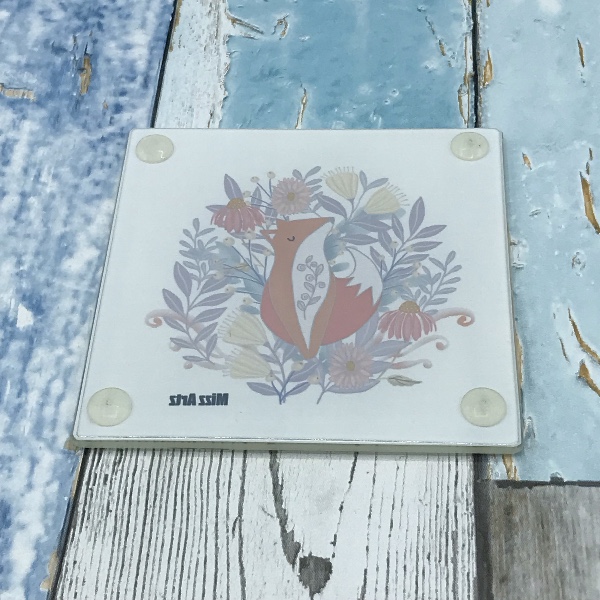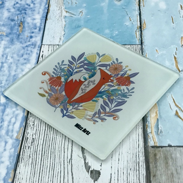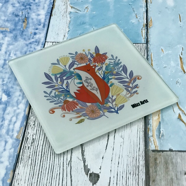 A high quality toughened glass coaster featuring my original artwork ‘Foxy Business’. A happy fox takes a quick nap, hiding out safely in the flowers and leaves. A beautiful and practical gift for all fox lovers and collectors of fox artwork. Size 10cm x 10 cm